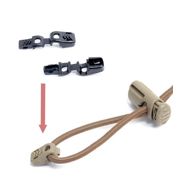 I.T.W. Nexus製のキャノンクリップは主に市販のパラコード/ショックコード(4mmサイズ)と組み合わせる為の「つまみ」に当る部品である。また、コードロックの抜け防止にも最適。軍用に開発され、Tanカラー及は近赤外線に対する偽装効果を有している。