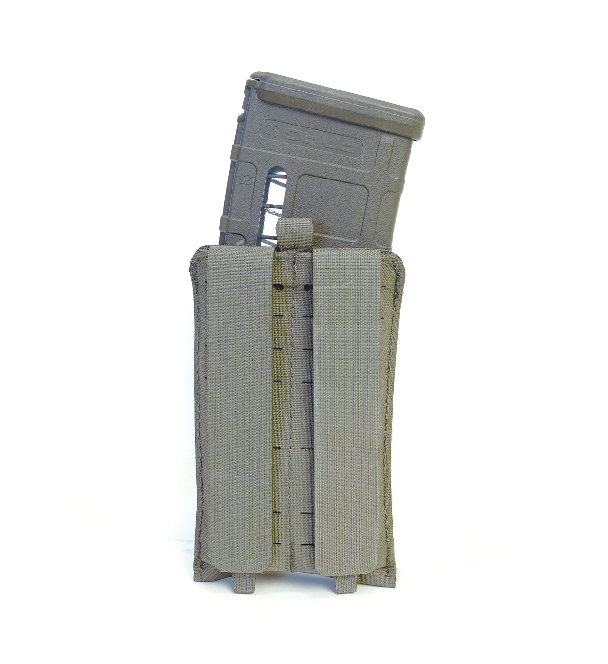 4d.t.g. Elastic Mag Utility Pouch(伸縮式汎用弾納 1連)は、近年トレンドの伸縮式の弾納である。本体正面はゴム製につき、収納物を選ばない。